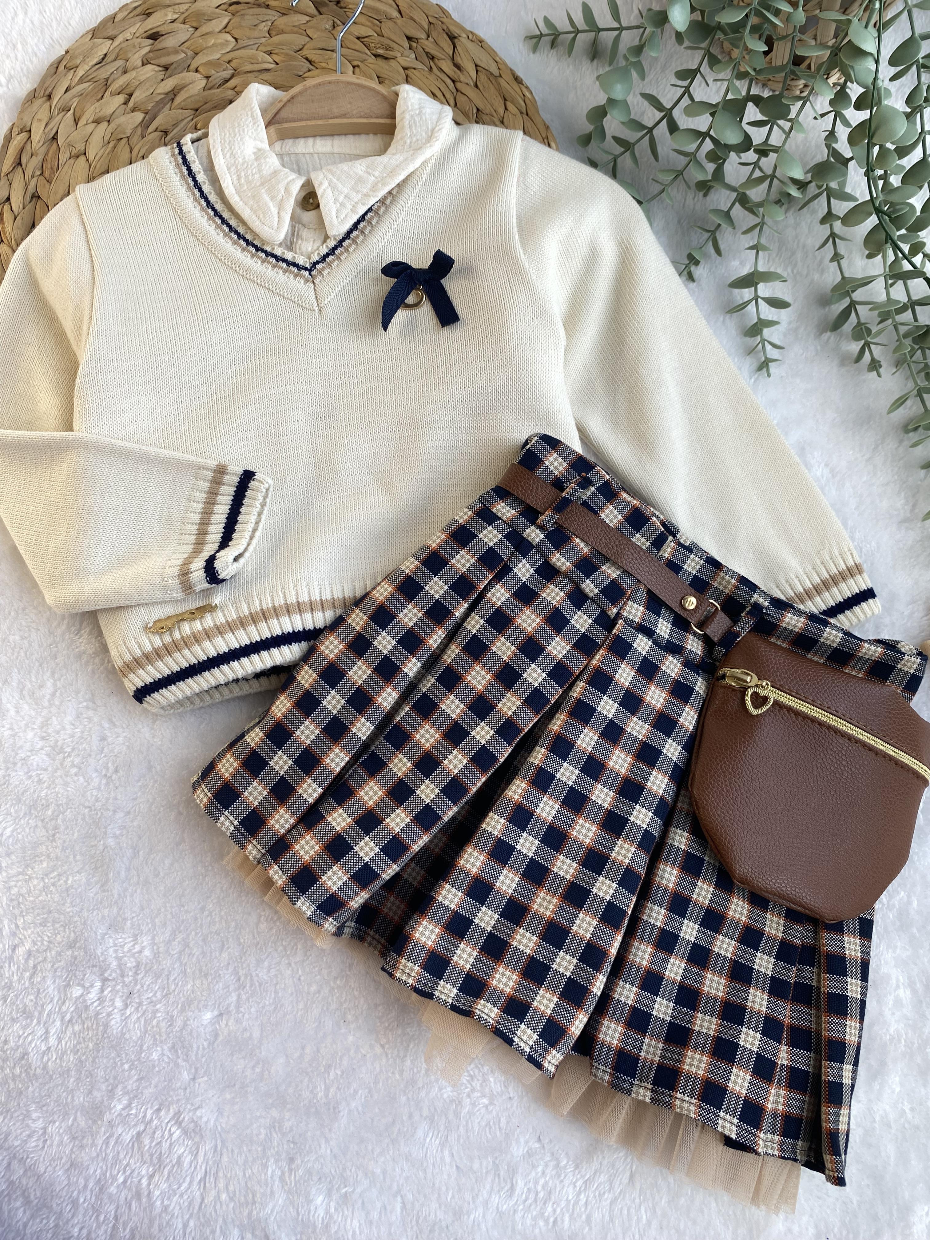 Triko kazak,müslin gömlek,etek ve çanta olarak 4lü takımdır